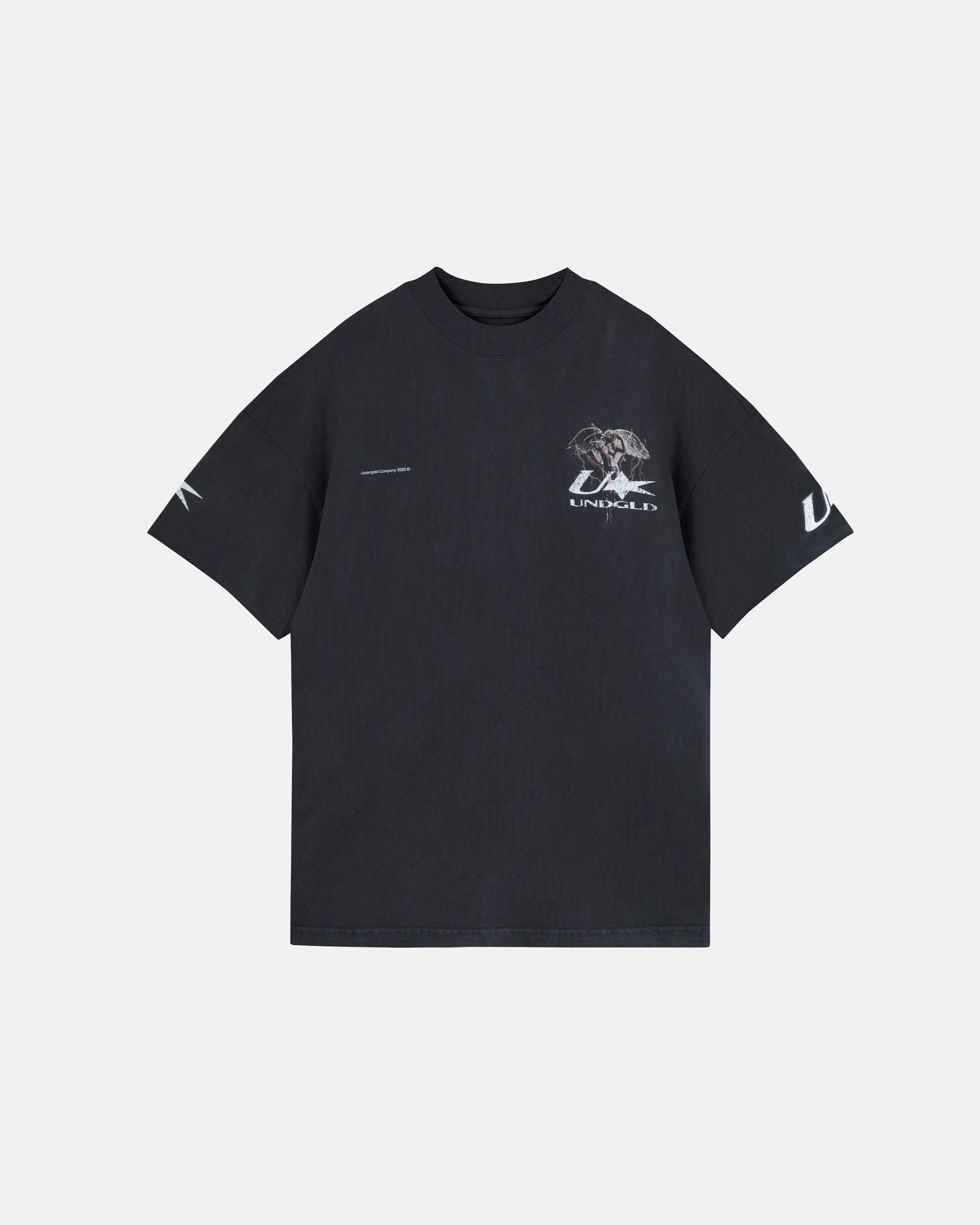 Vintage Black T-shirt with an Oversized fit, made of 100% heavyweight cotton fabric (230 gr), intervened with white flat plastisol print on the front and back. Also intervened with graphic polychrome print on the front and back.