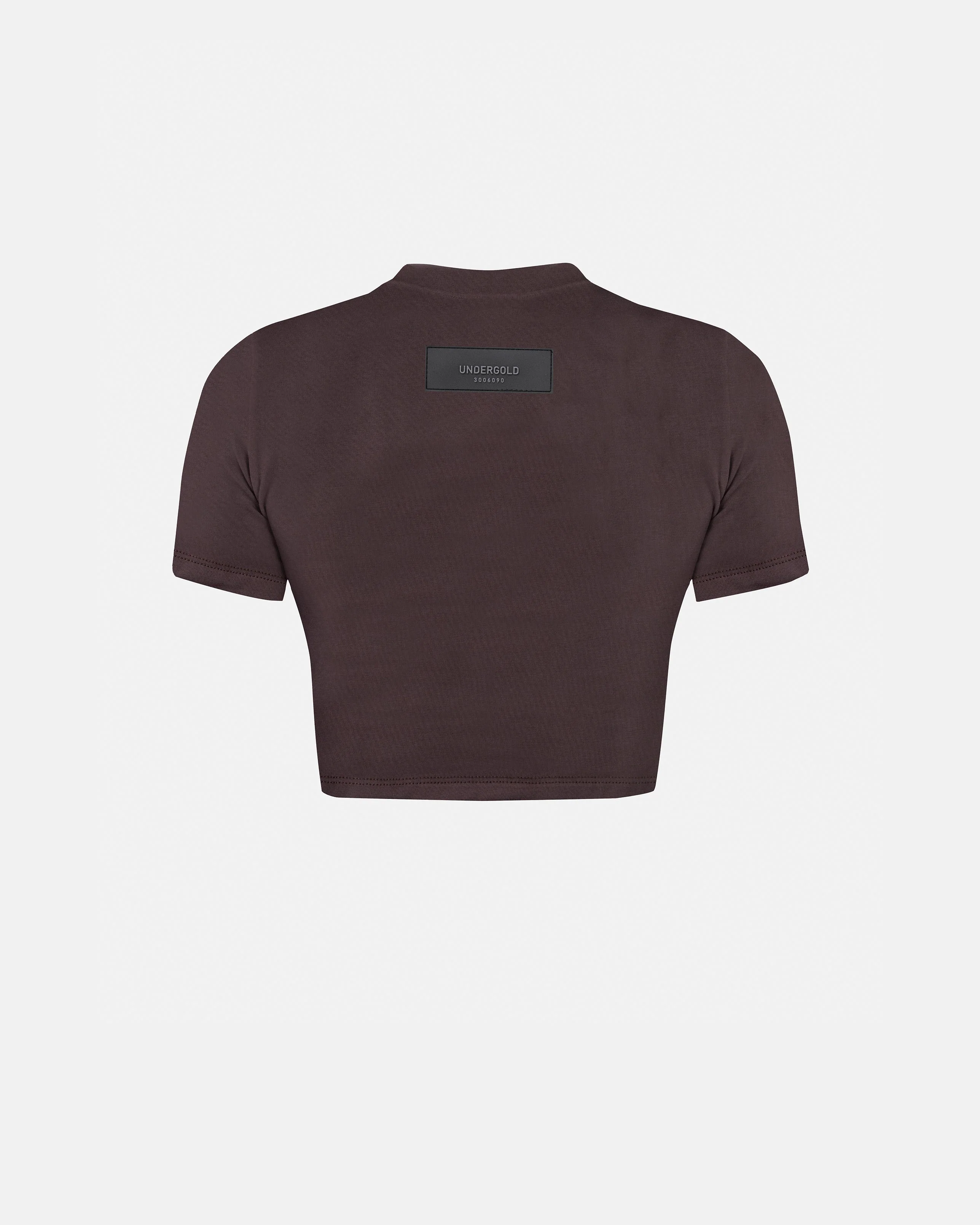 Brown Baby Tee with a Slim fit, made of 96% cotton - 4% Spandex fabric (200g), intervened with tone to tone semi-high density print centered on the front.