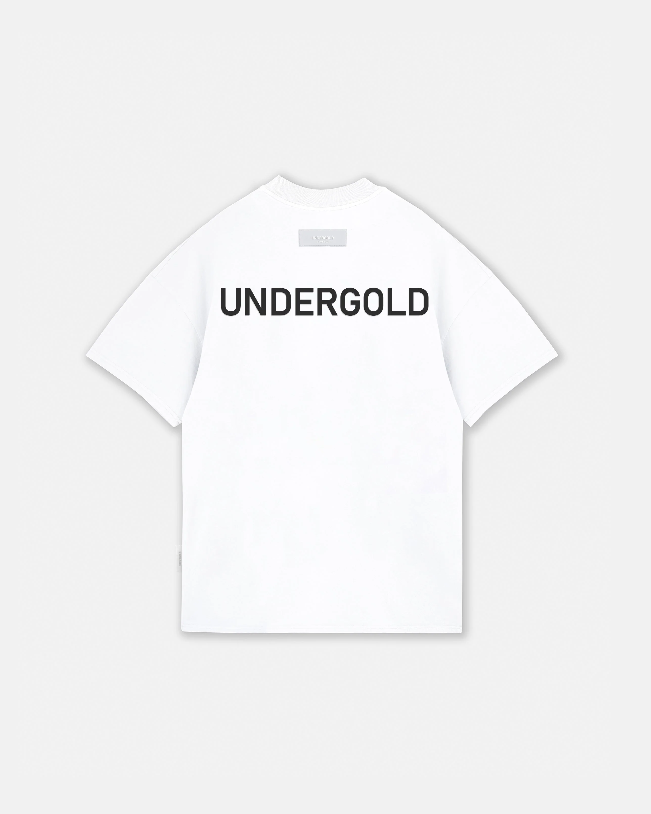 Camiseta blanca en molde oversized, 100% algodón (190g). Estampado tono a tono en semialta densidad al frente y atrás, detalle en rubber en la espalda alta y etiquetas tejidas al frente y lateral.