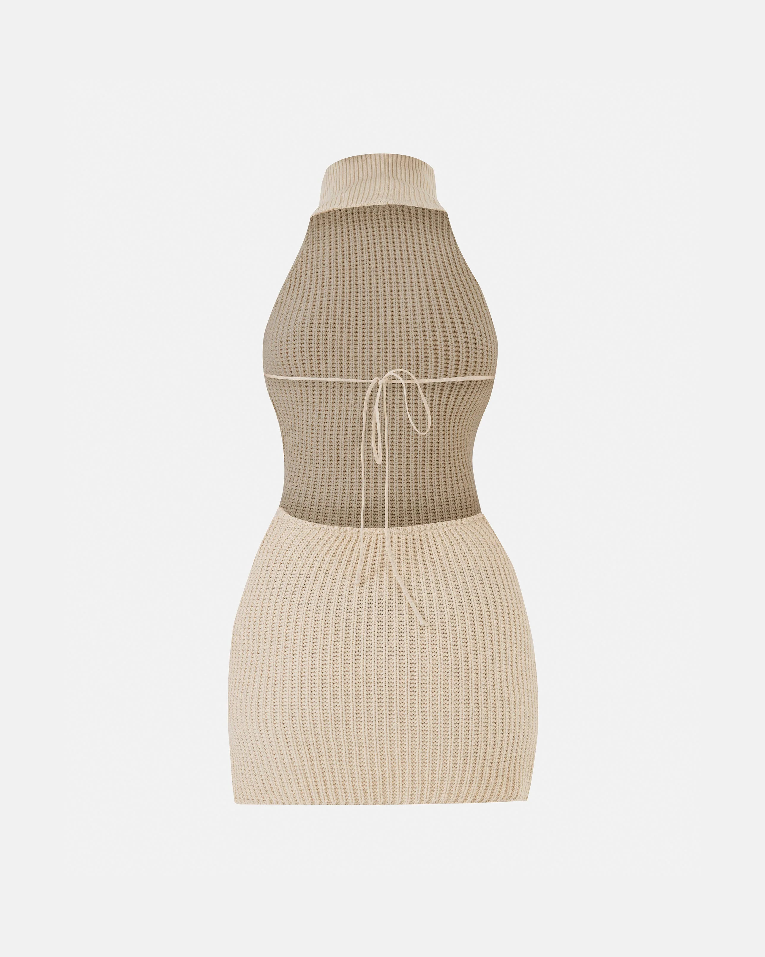 Ā Cream Turtleneck Knitted Dress with a Slim Fit, made of 100% acrylic fabric, designed with a back neckline and fitted to the body to highlight the female silhouette.