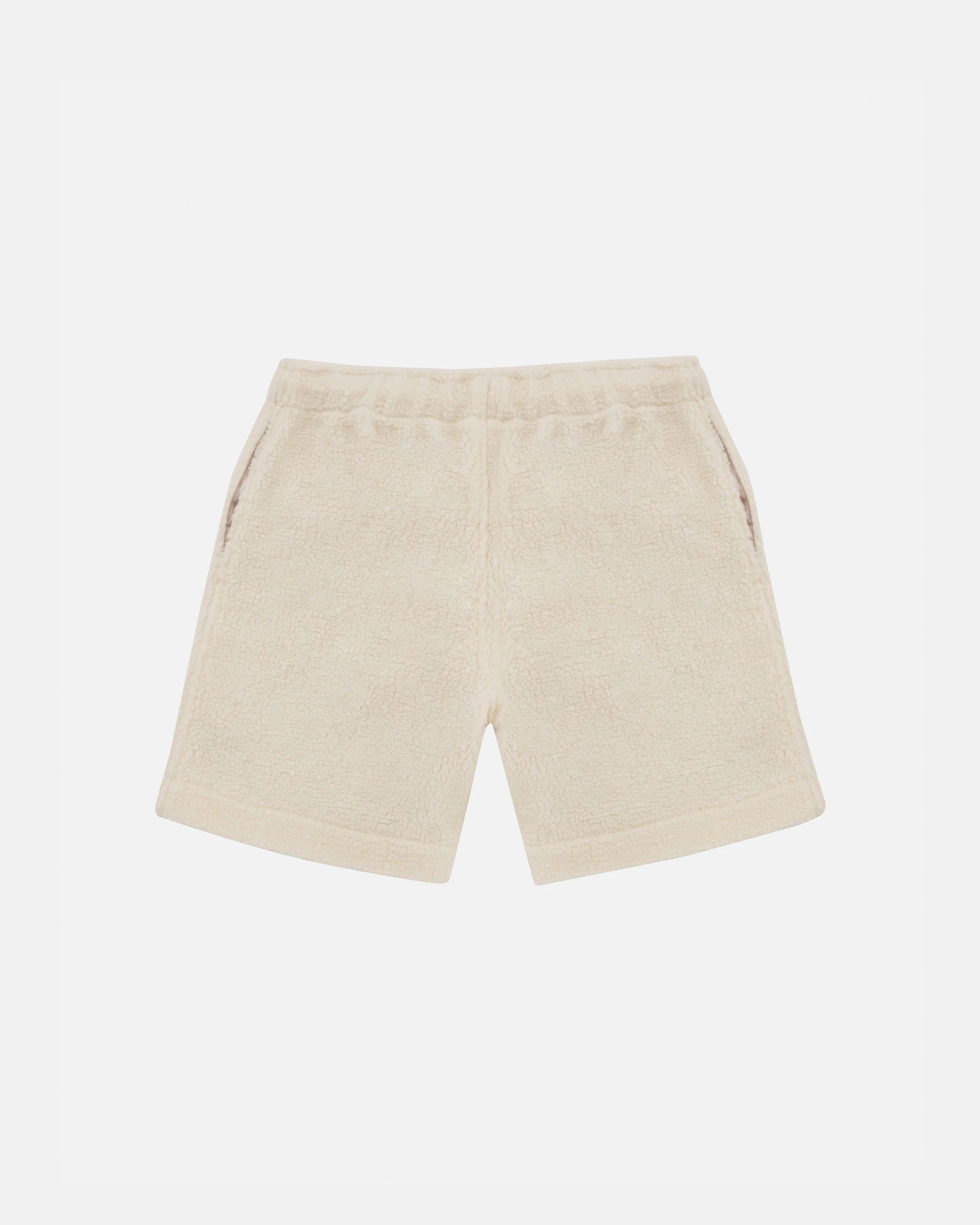 Ā Cream Fleece Short with an Oversized fit, made of 100% polyester fabric - Polar Fleece, intervened with gray embroidery on the front left leg.