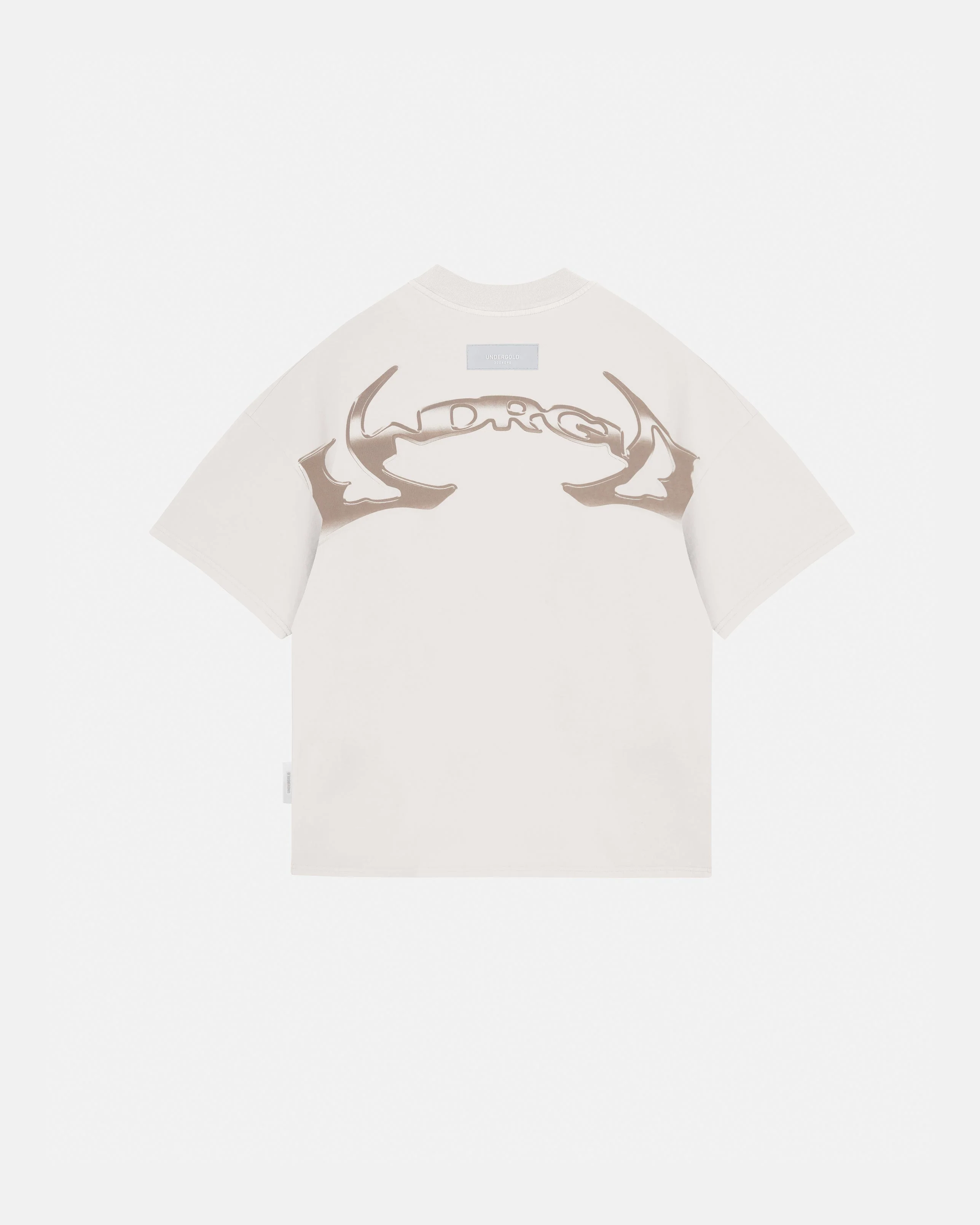 White T-shirt with an Boxy fit, made of 100% heavyweight cotton fabric (230 gr), intervened with polychrome graphic print and brown semi high density print on the front, also intervened with brown flat plastisol print on the back.